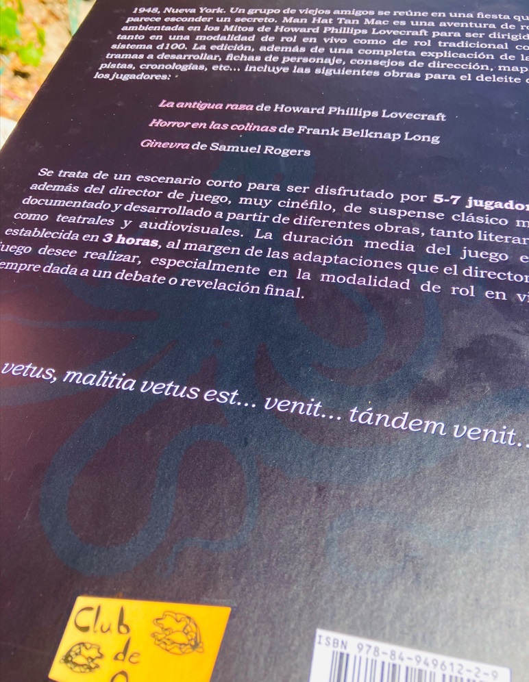 1948, Nueva York. Un grupo de viejos amigos se reúne en una fiesta que parece esconder un secreto. Man Hat Tan Mac es una aventura de rol ambientada en los Mitos de Howard Phillips Lovecraft para ser dirigida tanto en una modalidad de rol en vivo como de rol tradicional con sistema d100. la edición, además de una completa explicación de las tramas a desarrollar, fichas de personaje, consejos de dirección, mapa pistas, cronologías, etc... incluye las siguientes obras para el deleite de los jugadores: